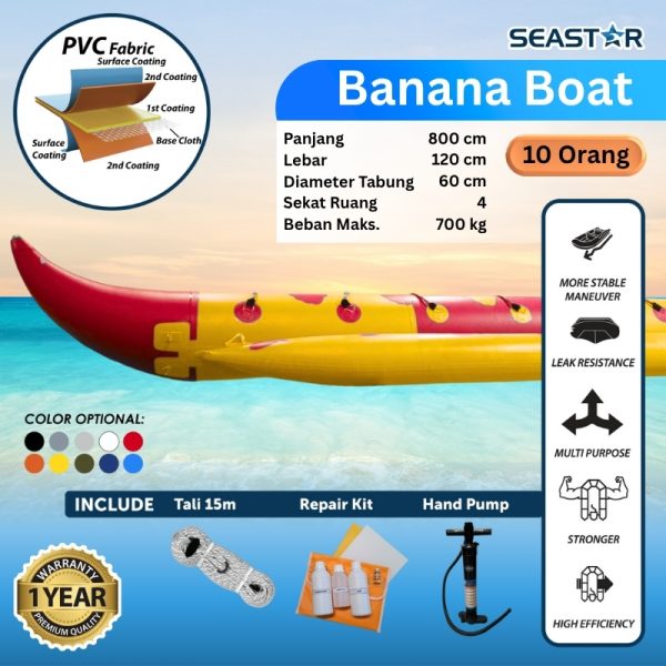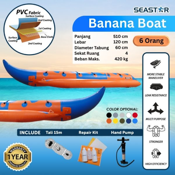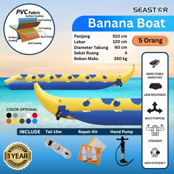BANANA BOAT SBB 5 Kapasitas : 5 Orang Panjang : 510 cm Lebar : 120 cm Diameter tabung : 60 cm Sekat ruang : 4 Kap. Berat penumpang : 350 kg