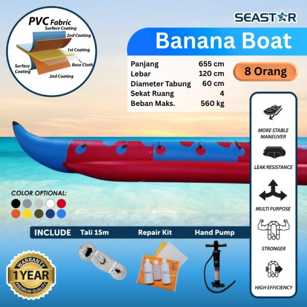 BANANA BOAT SBB 8 Kapasitas : 8 Orang Panjang : 655 cm Lebar : 120 cm Diameter tabung : 60 cm Sekat ruang : 4 Kap. Berat penumpang : 560 kg